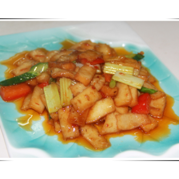 材料:鱼皮豆腐 ;西芹、黄瓜、蒜薹、红椒、甜面酱(或拌面酱)