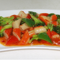 将蟹肉棒、青红椒切块,然后放入沸水焯熟捞出,放入大碗中;锅内放油烧热,加入酱、蒜炒香,导入适量番茄沙司翻炒,加入香油、盐味精等调料拌匀;.倒入产品翻炒,加少许勾芡,炒匀后即可出锅。